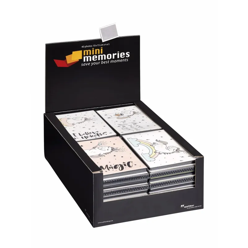 Mini album with black pages, soft cover and high quality laminated art paper in four different designs assorted. The mini album offers space for 40 photos of size 10x15 cm and will be delivered in a colour matched display with 36 pieces albums. The mini album cover can be replaced by your personal picture.