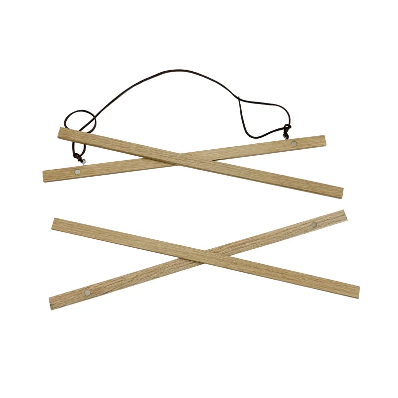 The poster hanger comes with a stylish leather strap that complements the minimalist aesthetic. Start by securely fastening the provided loop to the wooden rails, then easily tie the leather strap to these loops. A simple knot is enough to ensure it is tightly secured for safe display.