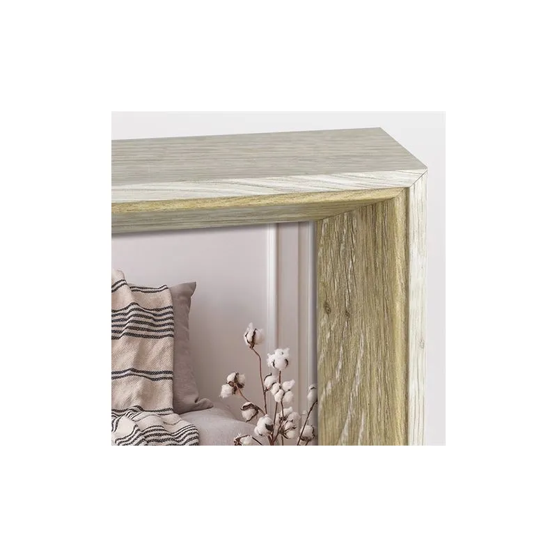 The PZC68 Scott Cream 15x20 cm by Zep Italia is a single photo frame suitable for one 15x20 cm photo. The article stands out by its diagonal inward frame, which gives the photo frame an almost painting-like appearance. The outer frame is light grey; the inner frame has a cream-colored wood motif. The total dimensions, including the frame, are 17x22 cm. The frame is made of MDF.