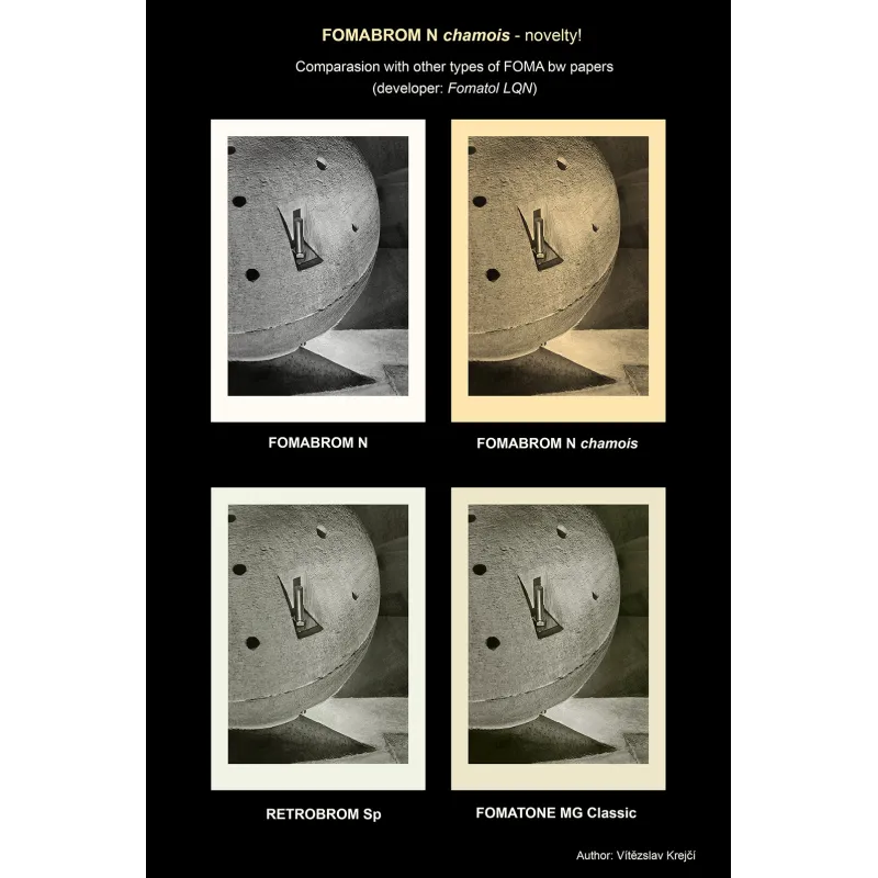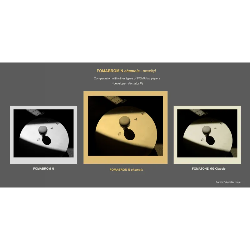 Fomabrom N chamois is a black and white photographic paper produced on a baryta paper base in a retro tone. The chlorobromide silver emulsion gives the resulting silver image a neutral to slightly warm tone. The paper enables reproduction of a very rich halftone scale and is characterized by a saturated black rendering. It has a medium level of optical sensitivity, which is suitable for the application of enlargement and contact copying methods.