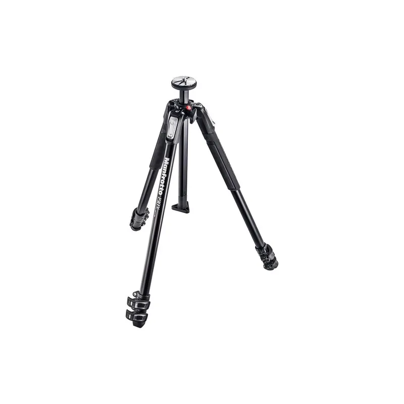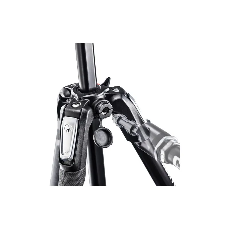 The Manfrotto MT190X3 Aluminum Tripod is an addition to the popular 190 series, adding a Quick Power Lock System, ground level adapter, and an Easy Link attachment. It can hold up to 15.4 lb of gear and has a maximum height of 63". The ground-level adapter replaces the center column to allow the tripod's mounting plate to sit just 3.5" above the ground with the legs at their widest angle.