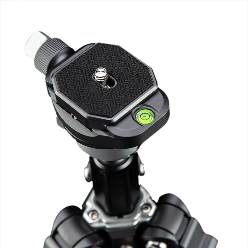 The small ball head you'll find in the kit with the Fotopro Fly-1 tripod will allow you to conveniently adjust the selected position of your camera. It is equipped with a precise angle scale and a level. There is also a panorama control system and the ability to position the equipment at a 90° angle and film or shoot vertically. Convenient connection of the head to the camera or smartphone mount will be provided by a quick-mount plate, compatible with the Arca-Swiss standard.