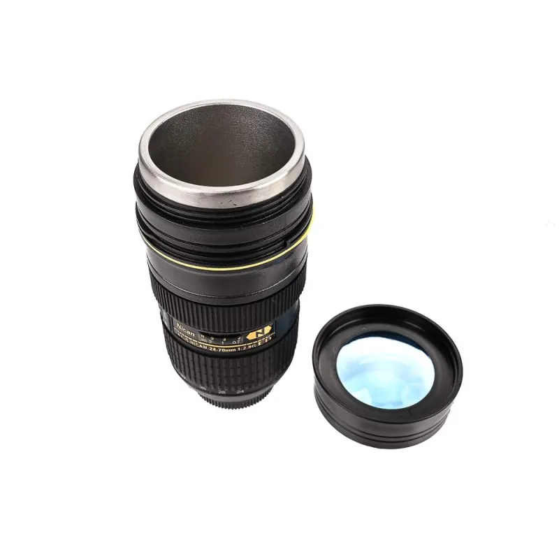 The outside of the drinking cup is shaped like a camera lens and features the same textures and details, making it an eye catching and remarkable design. The inside of the cup is made of stainless steelwhich makes it a convenient and practical solution on the go or in the office.