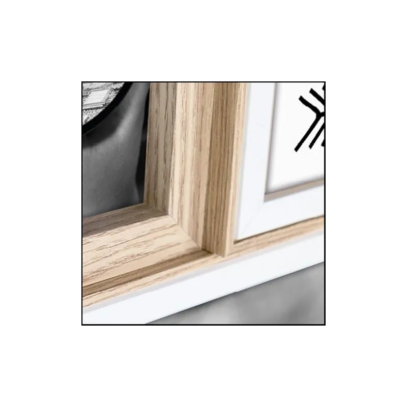 The TJ327 Watson from Zep Italia is a photo frame suitable for 7 photos. It can hold the following sizes: 4 times 10x15 cm, 2 times 13x18 cm, and 1 time 15x20 cm. The photo frame has a vintage look, and total dimensions, including the frame, are 48x48 cm. It is suitable for vertical placement and can be hung on the wall.