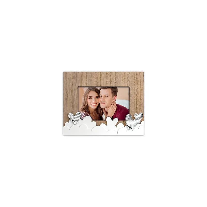 The Zep Photo Frame HP767 Romina Horizontal 10x15 cm is a wooden photo frame suitable for 1 photo of 10x15 cm. It comes in white and brown colors with a decorative print and a 3D heart-shaped decoration on overlapped levels. The frame is available in table and suspension versions, with a love theme. The total dimensions, including the frame, are 17 x 22 cm (W x H).