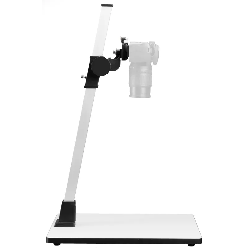 The copy stand is used for photographing documents or even small objects . The quick-release plate (1/4'' and 3/8'') allows you to quickly and easily attach your camera to the 73 cm high column of the repro stand . This is equipped with a toothed rack so that the height can be adjusted. Objects to be photographed can be positioned exactly under the camera on the 40 x 48 cm base plate .
