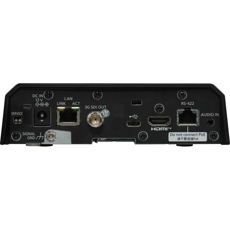 The integrated lens provides a 35 mm equivalent focal range of approximately 25-500 mm. UHD output is available up to 2160/29.97p or 25p via HDMI (422, 10-bit). The USB-C device port supports UVC/UAC for USB workflows. A 3.5 mm mic/line input with plug-in power allows audio embedding on HDMI and IP streams. i.Zoom extends to 23x in UHD and 30x in FHD, with a digital extender offering 1.4x/2x options. Minimum illumination is 3 lx (F1.8, 59.94p, 50 IRE, 42 dB).