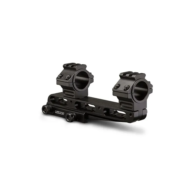To use the Konus Cantilever Mount Universal, loosen the upper ring half from the bottom half. Then unscrew the ring clamp at the bottom left, after which you can attach it to the Weaver or Picatinny rail. If a tube of 25.4mm is used, all the four reduction rings must be placed after which you place the rifle scope on the lower ring halves. Now the upper ring halves are attached to this and the rifle scope can be set in the desired position. When the rifle scope has reached the correct position screw it on firmly.