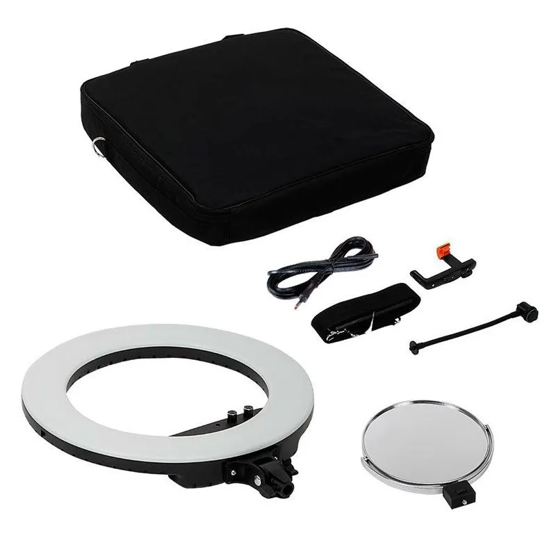 The Caruba Round Vlogger 18 inch LED is the ideal ring lamp for vloggers and model photographers. The lamp has an adjustable color temperature from 3200 to 5800K, which allows you to set the lighting in any situation. You can take the best selfies with the included smartphone holder and mirror.