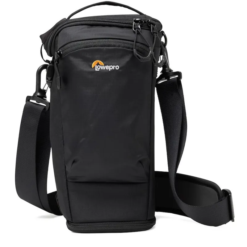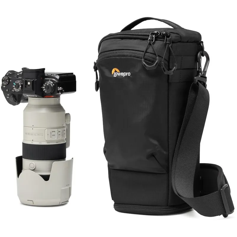 This toploader is perfect for outdoor events, featuring an expansion section for lens hoods and a side-opening door for easy access. The quick-close buckle ensures fast retrieval, while the interior divider allows for organized storage of a camera and an additional lens.