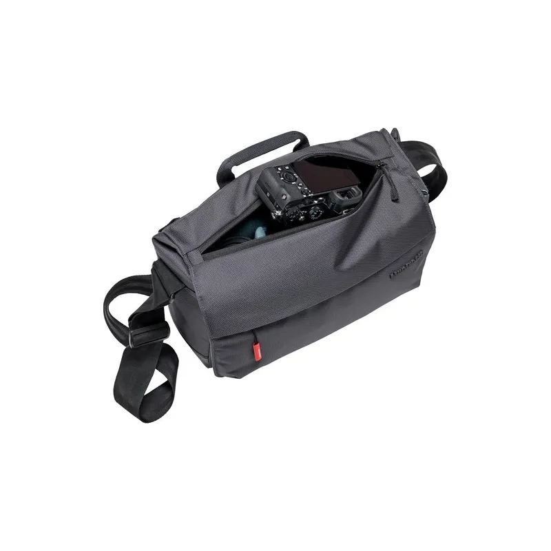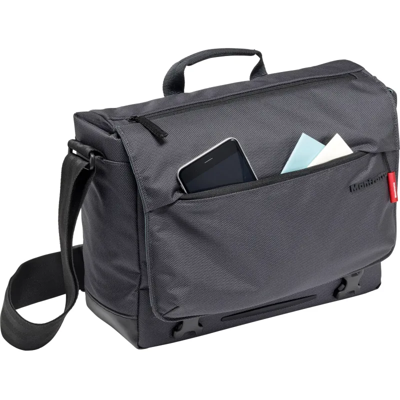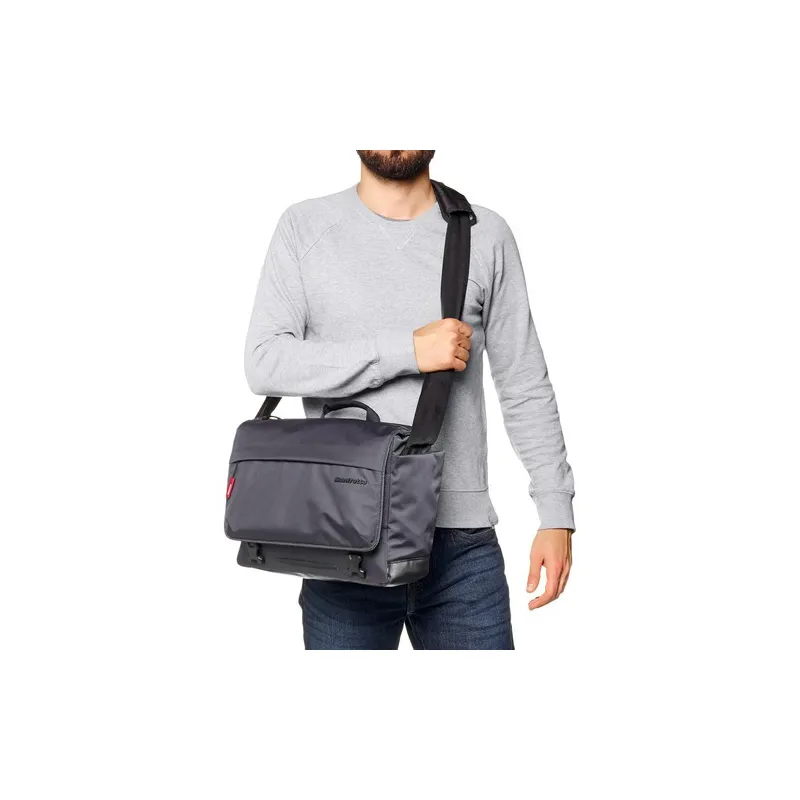Store, transport, and protect your premium mirrorless camera with standard zoom lens attached, two additional lenses, and related accessories with the gray Lifestyle Manhattan Speedy-10 Camera Messenger Bag from Manfrotto. The bag features a large front flap with buckle closure and a top zipper for easy access to gear. Padded, touch-fastening dividers make organizing gear fast and easy. Front, back, and side pockets provide plenty of space for small items. Inside the bag is a padded compartment for an up to 12" laptop or 12.9" iPad Pro.