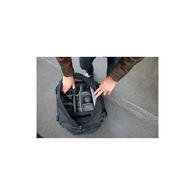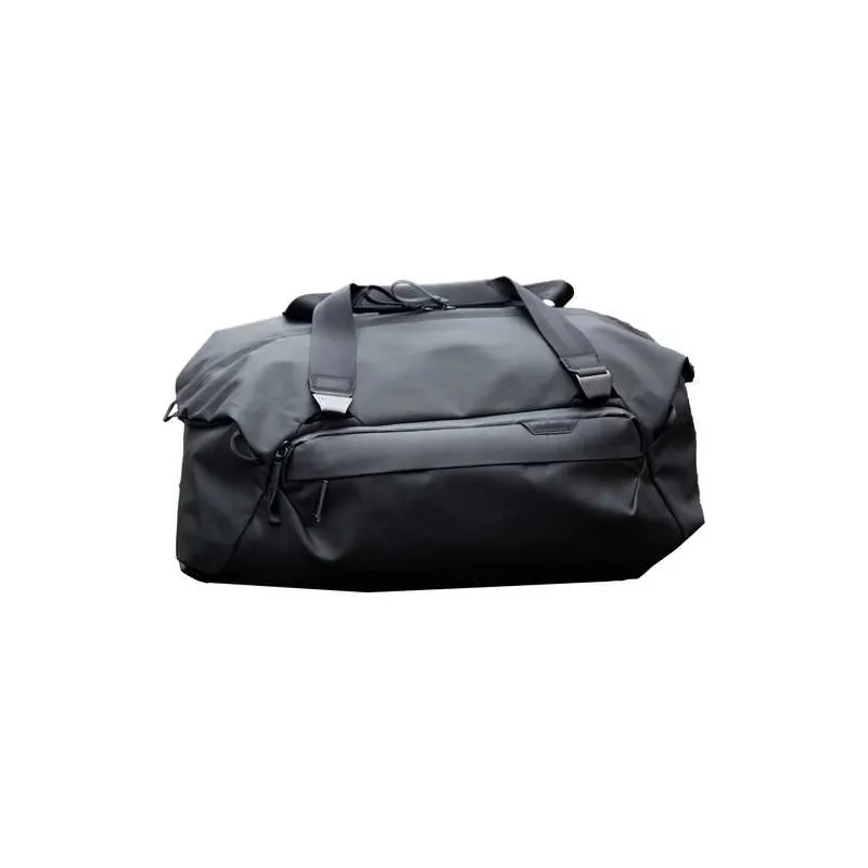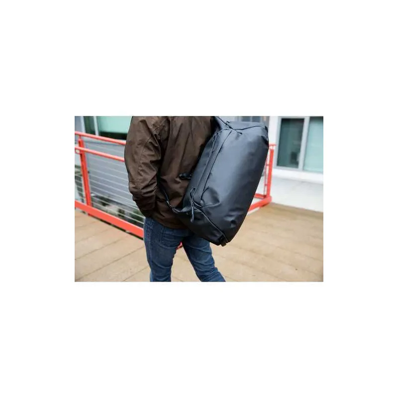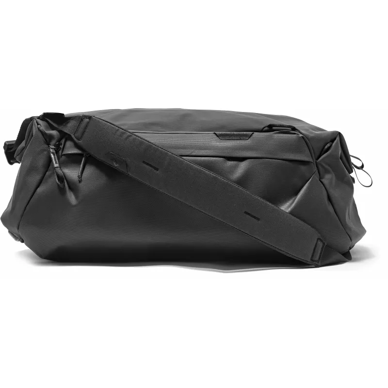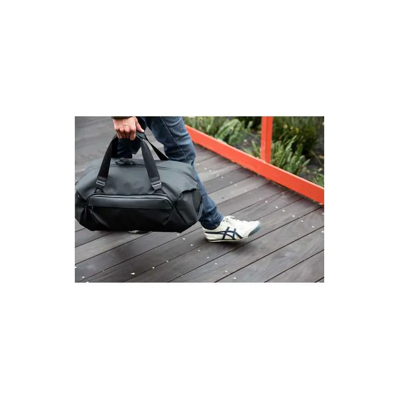 The Travel Duffel 35L in black from Peak Design is a duffel-style bag with an ID card holder that has a top made from 100% recycled 400D nylon canvas and a 900D ottoman-weave polyester fabric bottom. The long oversized #10 weatherproof zipper allows the bag to be opened wide so you have ample room and easy access to equipment. The bag is designed to hold three optional packing cubes and there are two internal and four external pockets for accessories.