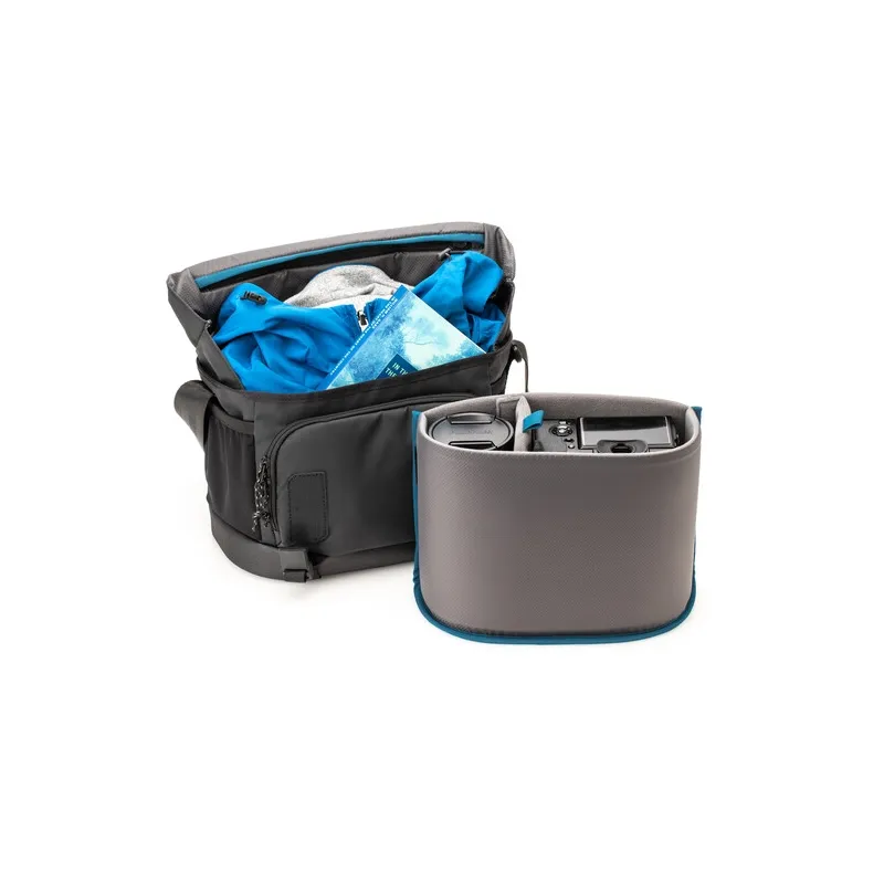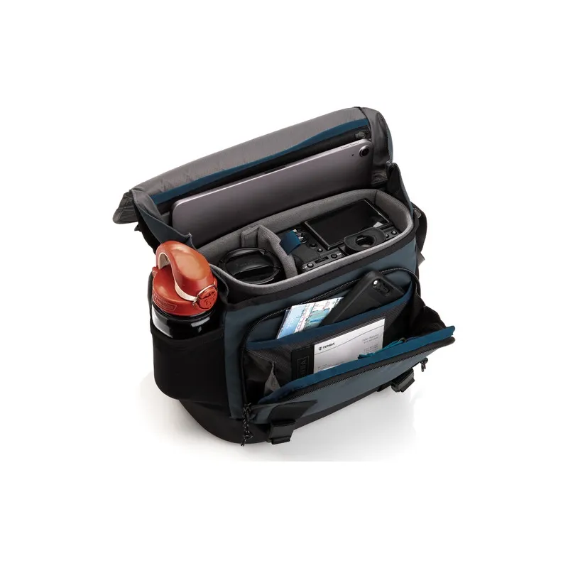 Built for seamless transitions between photojournalism and sports photography, urban exploration and adventure travel, and all kinds of social events with or without a camera, the blue Tenba DNA 9 Slim Camera Messenger Bag can hold a camera with two or three lenses plus a flash, accessories, personal gear, and a tablet. The camera and lenses fit within a padded insert in the main compartment that can be removed to allow its use as a conventional bag. Thoughtful design features and proprietary hardware make this bag easy to use and durable against the elements.