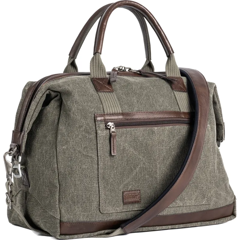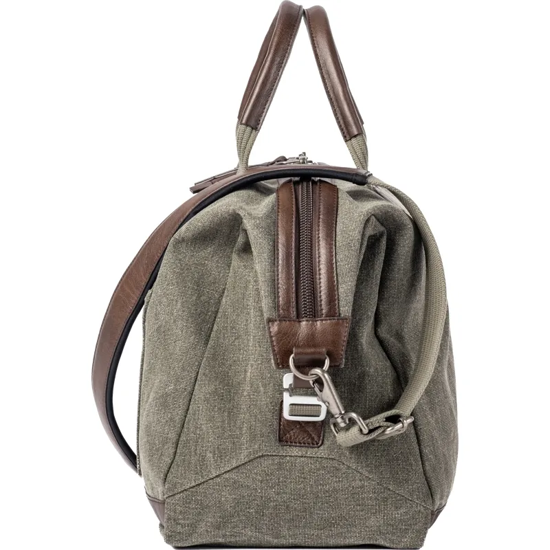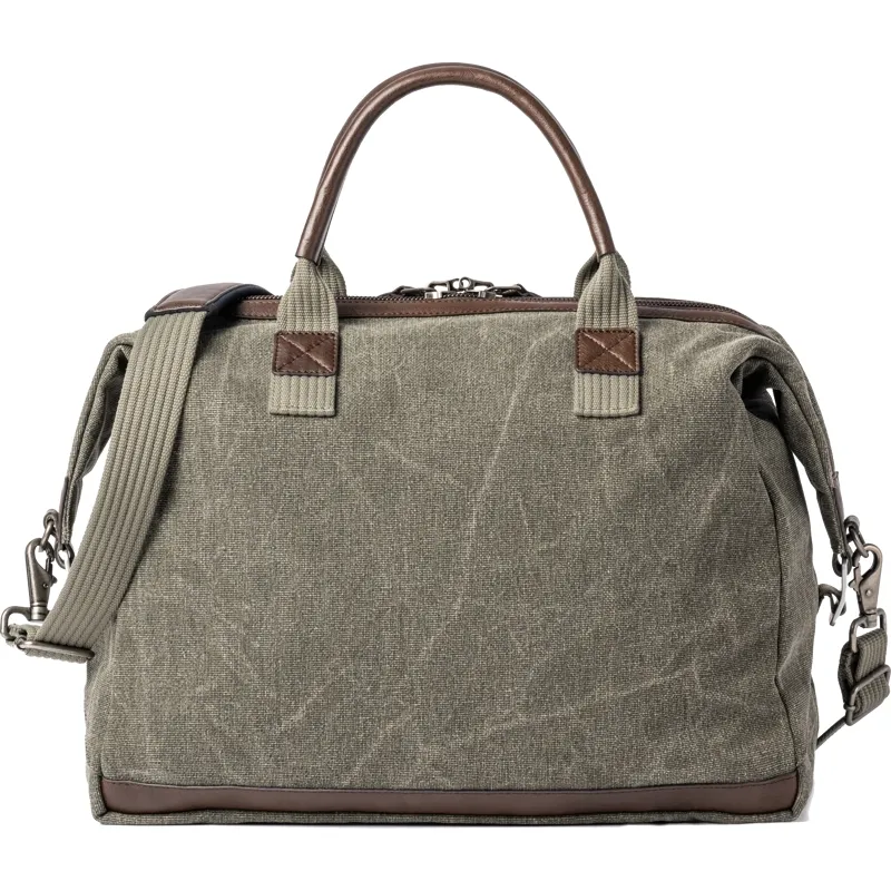 The Retrospective Weekender is a classic travel duffel made from pinestone-colored stonewashed cotton canvas. It also features antiqued metal hardware and Dakota leather reinforcements. Zippered wings unclip to create a wide clamshell opening to its 26-liter main compartment lined with soft twill.