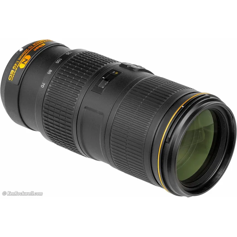Lens mount Nikon F. Lens type zoom lens. Focal length (wide angle side) 70 mm. F value (wide angle side) 4. Accessories: 67mm spring-type lens cap LC-67, rear cover LF-4, bayonet hood HB-60, soft case CL-1225.