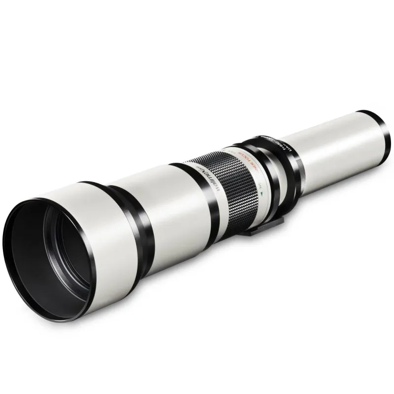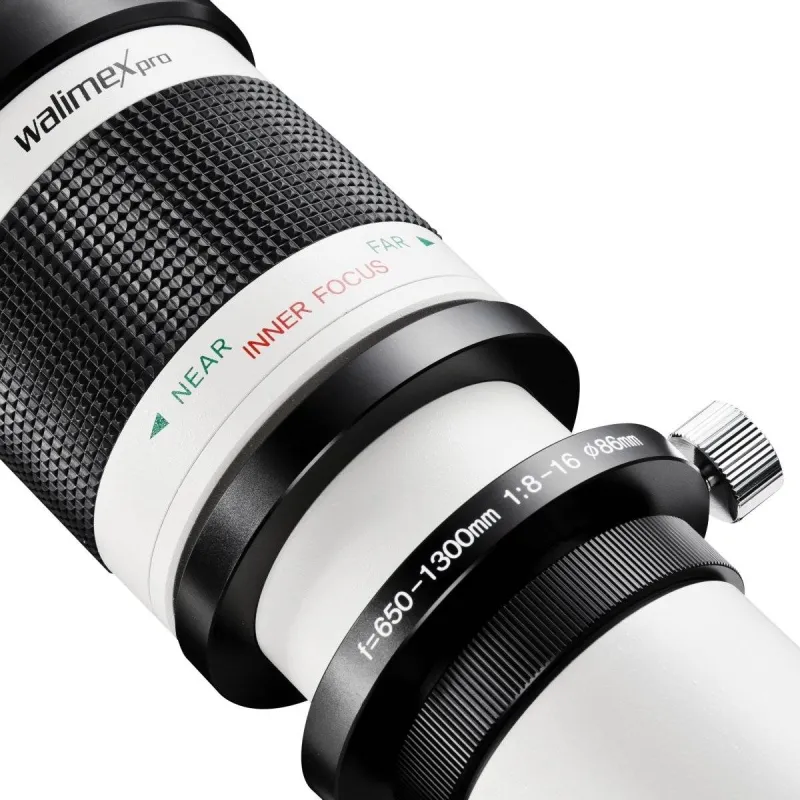 The walimex pro Telezoom Lens has an unusually long focal distance range of 650-1300mm at a speed of 1:8.0-16 (depending on focal distance). The sturdy metal casing and the high-quality coated glass lenses ensure a good image quality. The internal focusing (i.e. the front lens does not turn while focusing) enables the unproblematic use of polarising and graduated filters. With the help of the sturdy tripod mount ring the lens can be fastened to a tripod with an optimised balance point (because of the long focal distance we recommend the use of a tripod in order to achieve vibration-free exposure). With a comparatively short closest focusing distance of only 5 metres, the lens enables a sensational magnification at 1300mm. Focusing takes place manually. The lens can be used with aperture priority and manual exposure setting. Thanks to the easy handling, the lens is also especially suitable for beginners.