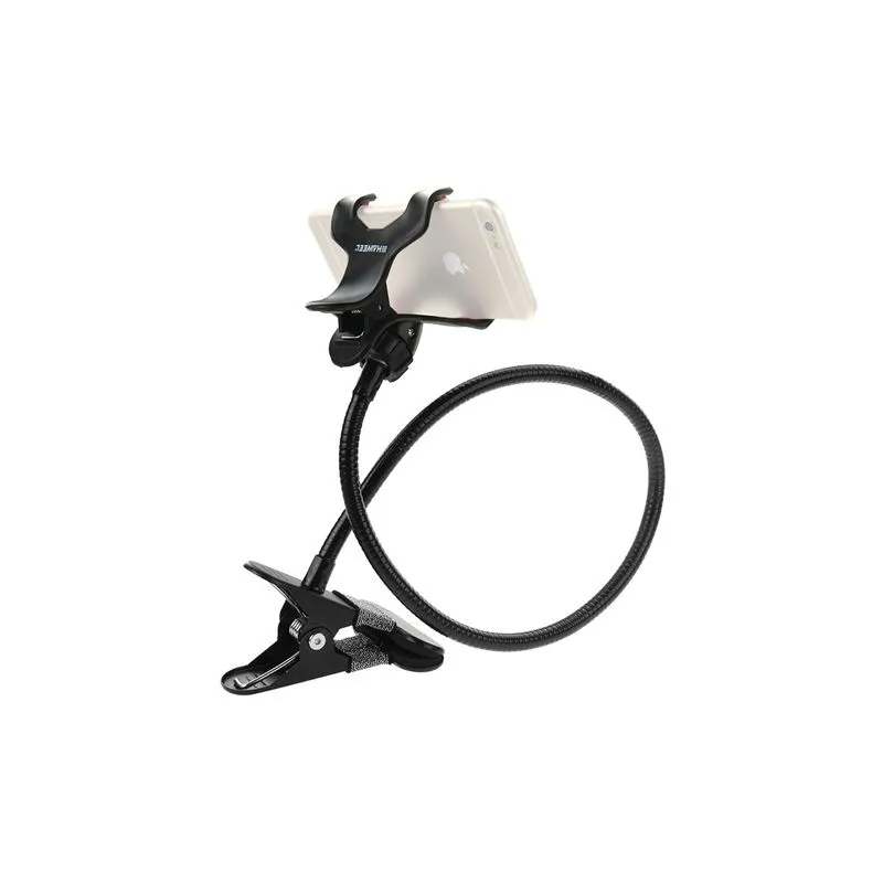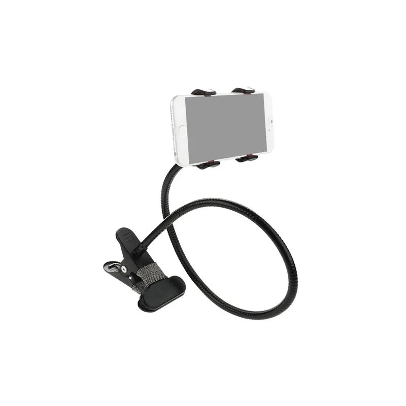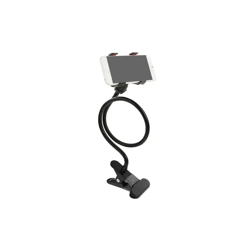 The CLP02 from StudioKing is a smartphone holder with flexible bar. You attach the clamp to the edge of a table, tube or other narrow object. Then you bend the bar in any direction and your smartphone can be firmly clamped in place. With the flexible head you can adjust the angle of the smartphone precisely. The bar has a length of 54 cm and the CLP02 weighs 318 grams. The smartphone holder is suitable for smartphones up to 12 cm wide. The smartphone clamp itself has a width of 7 cm. The clamp which you clamp around a table or other object, is suitable for objects up to 6 cm. The width of this clamp is 7.7 cm.