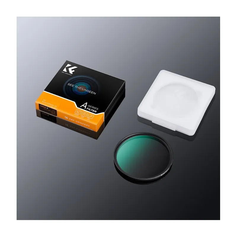 The K&F 49mm A Series Black Mist 1/4 Filter provides a soft cinematic effect, minimizes skin imperfections, and enhances image quality with German optical glass and a green anti-reflection coating.