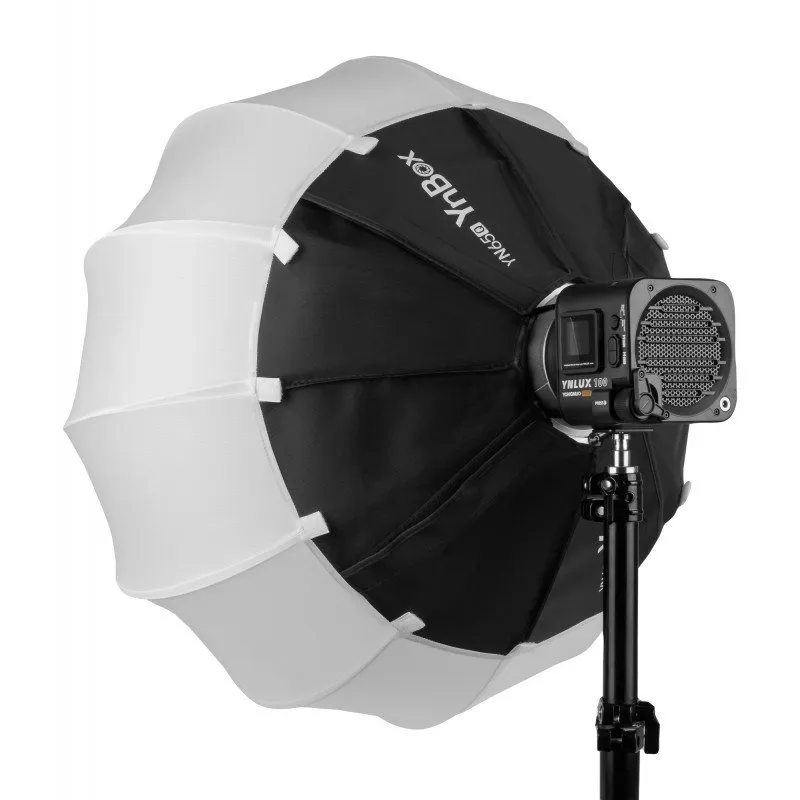 The Yongnuo YN65Q softbox is a versatile light modifier that works well for film and photography. It is a smaller alternative to the Yongnuo YN85Q, featuring a 65 cm diameter design that resembles a lantern in shape. The ultra-lightweight metal frame makes the accessory extremely lightweight at just 1.1 kg. This softbox is designed to provide professional lighting when working with a camera or camcorder, allowing you to obtain soft light and manage unwanted shadows.