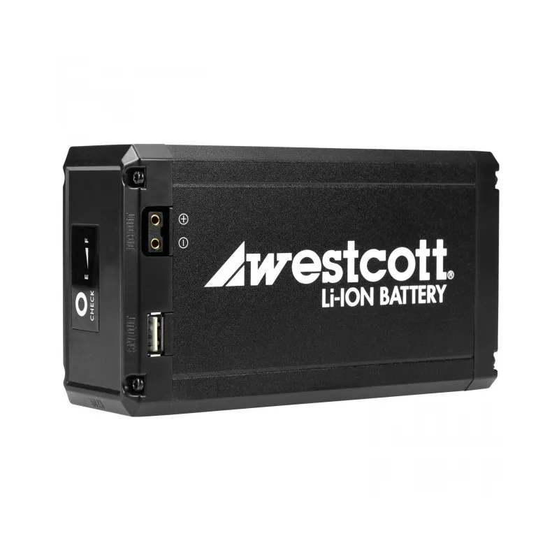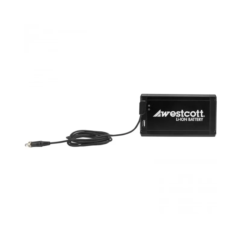 The Westcott Flex Portable Battery is a lightweight and portable solution to supply your Westcott Flex LED panels with power on location. The powerpack is provided with a lithium-ion battery with a capacity of 10400mAh and an output voltage of 14.8 volt. You can fully charge the powerpack in 3.5hours with the included charger. Fully charged, you are able to provide the Westcott 10x3" mat with power for up to eight hours or a 10x10" or 1x1" mat around the 1.75 hours.