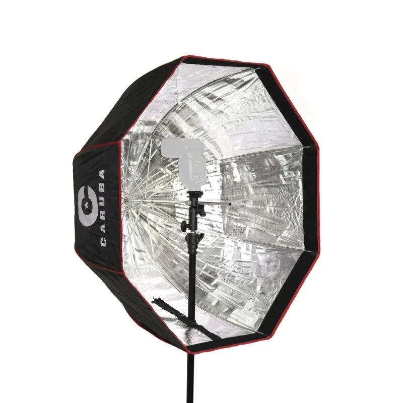The deep profile of the orb ensures maximum light output, which is evenly distributed over the entire surface. The octagonal shape of the softbox stimulates the light of the sun, creating a nice round high light in the eyes of your model. The Caruba Orb Speedlight kit 80cm can be set up and used in seconds. Because the softbox opens like an umbrella, it can be stored just as quickly in the supplied carrying bag. Ideal for location photography.