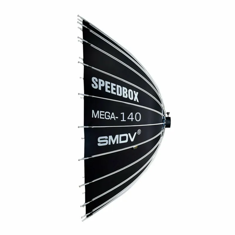The SMDV Speedbox Mega-140 Deep Softbox Silver is a 24-sided softbox with a diameter of 140 cm. The materials are heat-resistant and the speedring is made entirely of metal, with each of the 24 rods being detached individually when the reflector is folded down. This is ideal because it saves time when mounting and dismounting the diffuser. With the Speedbox you get a softer, diffused and more even lighting on the object to be photographed. The softbox comes with a Bowens speedring insert.