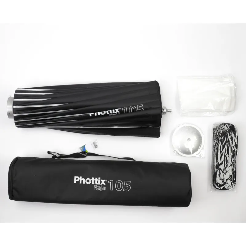 The Phottix Raja series of professional-grade light shapers are durable, portable, and above-all-else, assemble unbelievably fast. Phottix Raja series feature heavy-duty construction, Phottix’s Heat Resistant SL Tech Material, come in 10 sizes and styles, swappable speed rings available for popular lighting brands, and includes a travel bag. The Phottix Raja Quick-Folding Softboxes come with a Phottix-compatible S-Mount (Bowens). Swappable mounts for Elinchrom and Profoto are available and sold separately.