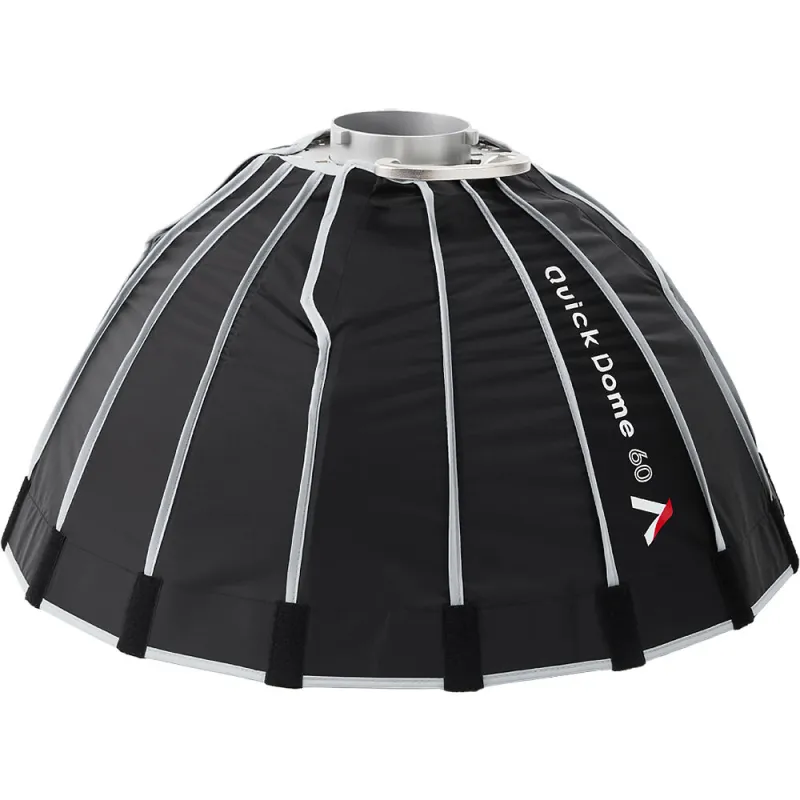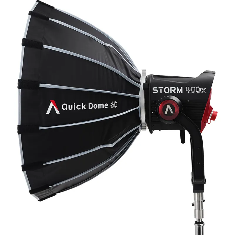 The Quick Dome 60 from Aputure is a circular Bowens mount softbox featuring a parabolic design that pairs with the STORM and Light Storm fixtures. The softbox has a reflective silver interior and provides a soft, even light output.
