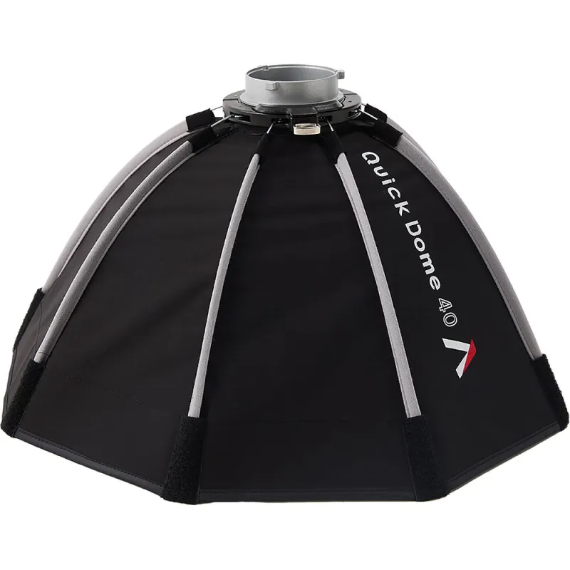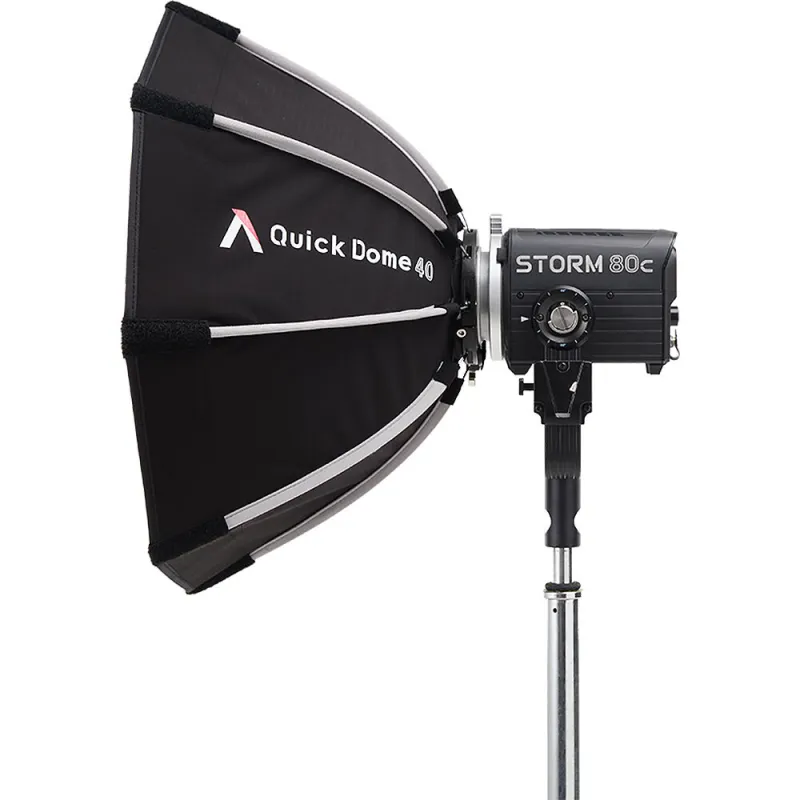 The Quick Dome 40 from Aputure is a compact circular softbox featuring a parabolic design that is designed to pair with the STORM 80c light fixture. The softbox has a reflective silver interior and provides a soft, even light output.