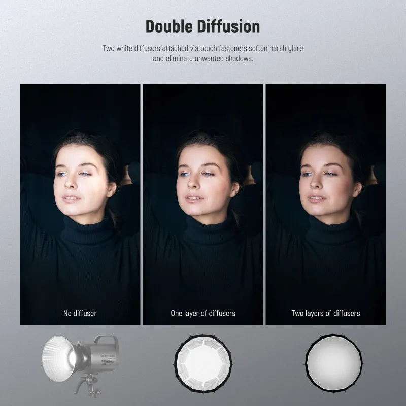 - Customizable Honeycomb Grid & Diffusers: Using the honeycomb grid can make the light shape more confined and directional, allowing the beam angle to be concentrated at 45°, which gives photographers a dramatic and expressive light effect to define their models' facial structure. The 2 pieces of high-quality diffusers can be freely combined in use.