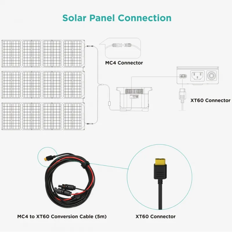 MC4 to XT60I Solar Cable 5m Connect a solar panel to an EcoFlow power station for clean, efficient, and reliable power wherever you go. The EcoFlow Solar to XT60i Charging Cable allows you to connect an EcoFlow portable power station to a solar panel.