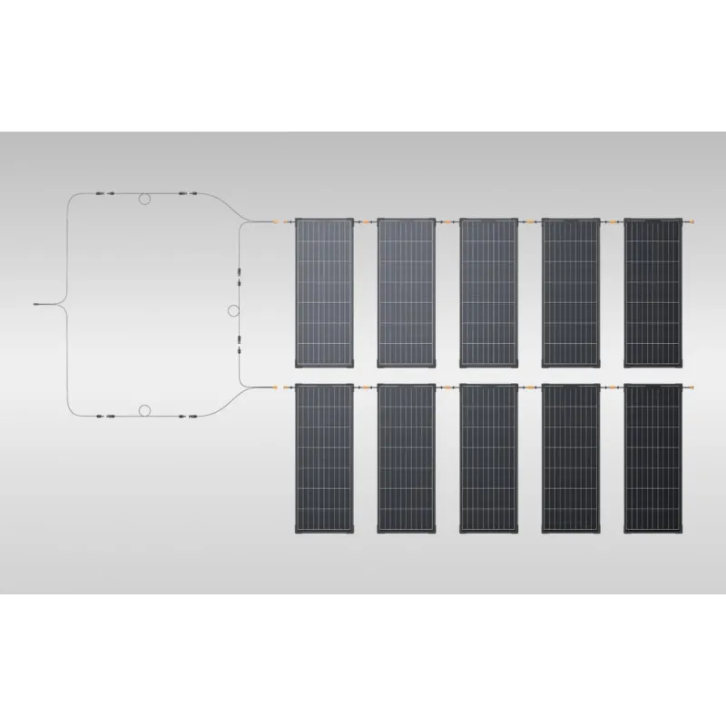 The EcoFlow set of two rigid photovoltaic panels is designed for motorhomes and mobile power systems. Each panel offers a nominal output of 130W and utilizes TOPCon cell technology, achieving conversion efficiencies of up to 25%. The 12mm-thick housing reduces air resistance, while IP68 sealing ensures dust and water resistance. The modules can be combined in arrangements of up to 10 units, allowing for tailored installations to meet energy demands. Compatibility with the EcoFlow ecosystem and standard MC4 and XT60 connectors simplifies integration into existing infrastructure.