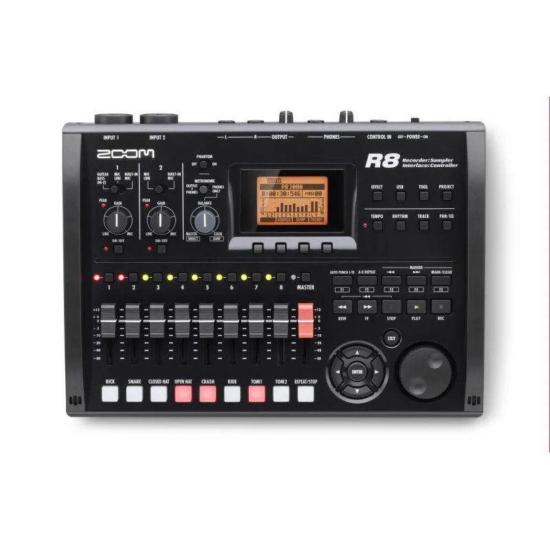 The R8 8-Track Digital Recorder/Interface/Controller/Sampler from Zoom is an ultra-portable music production solution, ideal for the musician on the go. The R8 packs the versatility of the larger R24 into a fresh compact design. Not only is the R8 an 8-track recorder that writes to SD flash memory cards, it's also a USB audio interface, a controller, and a pad sampler!