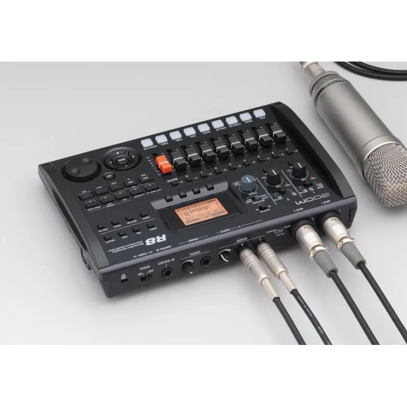 The R8 has 2-track simultaneous recording and 8-track playback. It can record WAV files at sample rates of 44.1/48kHz and bit rates of 16/24-bit. The files are captured to SD memory cards with capacities up to 32GB for making lengthy recordings. There are built-in stereo condenser mics for making recordings without extra equipment. There are also XLR/TRS combo inputs for connecting external microphones and instruments. There is 48V phantom power available on 2 tracks for supporting condenser mics. You can choose from over 140 DSP effects to add to your recordings, including guitar amp models and mastering effects.