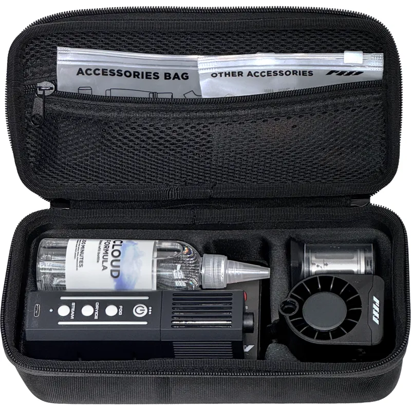 The kit includes a PMI Haze 3rd generation fan with Haze Blending technology for finer haze than its predecessor. It features a 2.4 GHz connection and a nozzle attachment for one-handed use, capable of hazing a 90 square meter studio in just two minutes.
