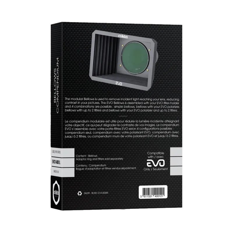 There are four possible combinations: using only the EVO Bellows, combined use with an EVO polariser, the bellows with one or two filters, or the EVO bellows with both an EVO polariser and one or two filters. If you only use the EVO Bellows, then you block all incoming light.