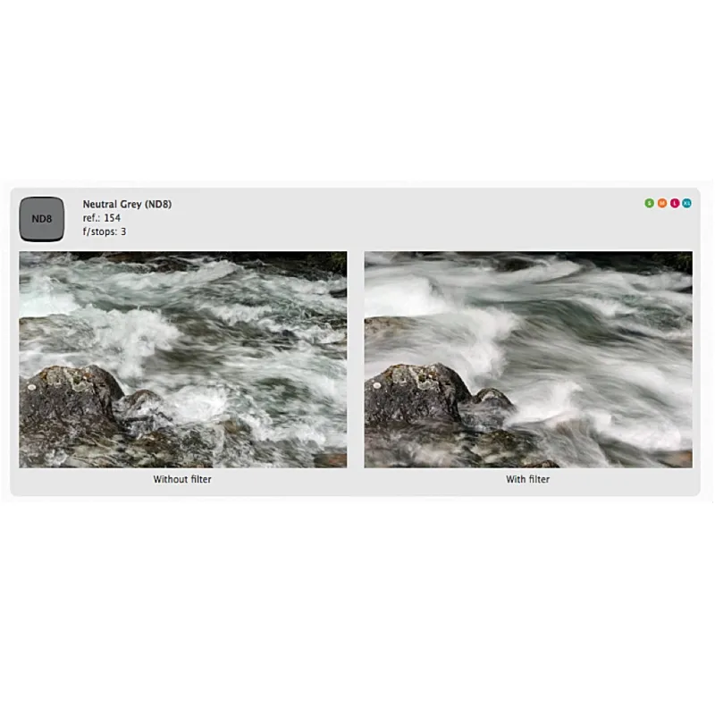 Neutral Density stands for Neutral density. Using this Z154 Neutral Grey filter, you can achieve a longer exposure time than would be allowed by the film speed or sensitivity of your camera's sensor. Think for example of capturing flowing water. This filter reduces light by three stops.