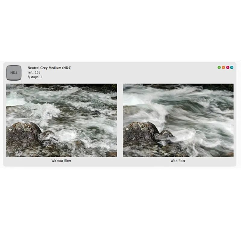Neutral Density stands for Neutral density. Using this X153 Neutral Grey ND4 filter, you can achieve a longer exposure time than would be allowed by the film speed or sensitivity of your camera's sensor. Think for example of capturing running water. This filter reduces light by approximately one stop.