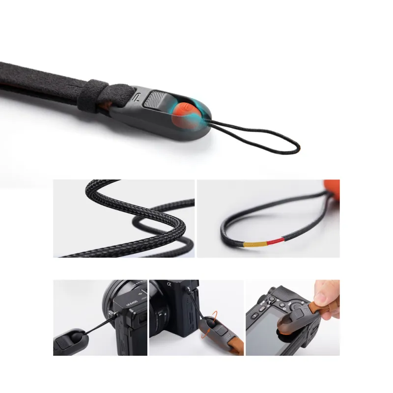 The carrying strap features four quick release beads and a TPU suspension ring for easy crossbody carry. The 1.5mm diameter quick release cord fits most cameras, and two belt adapters are included for extra compatibility.