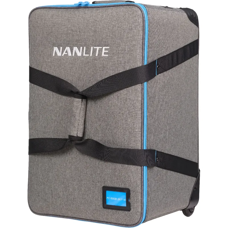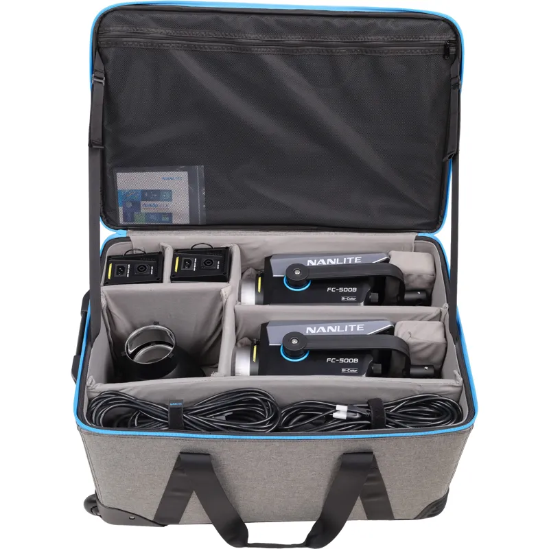 The Nanlite CC-ST-FC-2KIT Trolley Case is a padded, rotating case designed to hold and safely transport the FC-500B LED light (sold separately). It offers several convenient features: