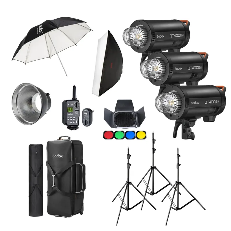 3 x Godox QT400IIIM (Bowens) 3 x Godox 260T Light Stand 1 x Godox Softbox Bowens Mount 80x120cm 1 x Godox 101cm Flash Umbrella White/Black 1 x Godox Power Remote XT 16 2.4G 1 x Godox BD 04 Barndoor Kit 1 x Godox Standaard Reflector 7 Bowens mount 1 x Godox CB 06 Carrying Bag 1 x Godox CB 03 Carrying Bag