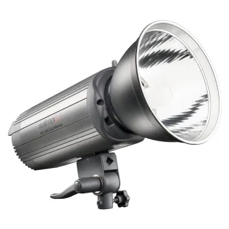 The highlights of this series include the built in 2.4 GHz receiver with 16 channels and 4 groups. When used with several flashes, each flash can thereby be separately controlled - for higher flexibility. All settings, like flash power or modelling light, can be conveniently made via the separately available radio remote trigger, but also by using the clearly arranged and user-friendly control panel on the flash itself. The power can be regulated from 1/1 to 1/32 and is, just like the 150W modelling light, infinitely and proportionally adjustable, whereby the light power can be exactly adapted to the prevailing lighting conditions. All settings are perfectly readable on the LED-display. The flash can be triggered via a Sync Cord, the built-in photo cell, via the test button or via the additionally available convenient radio remote trigger. A very strong cooling fan protects against failure caused by overheating.