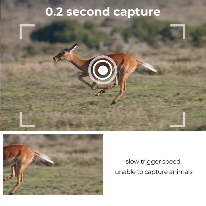 * Quick Capture; Unique Design. The A101XS tracking camera adopts a sensitive trigger speed of 0.2 seconds, accurately captures every exciting moment, and adopts a lightweight and compact unique design, which is easy to carry and apply to any place;