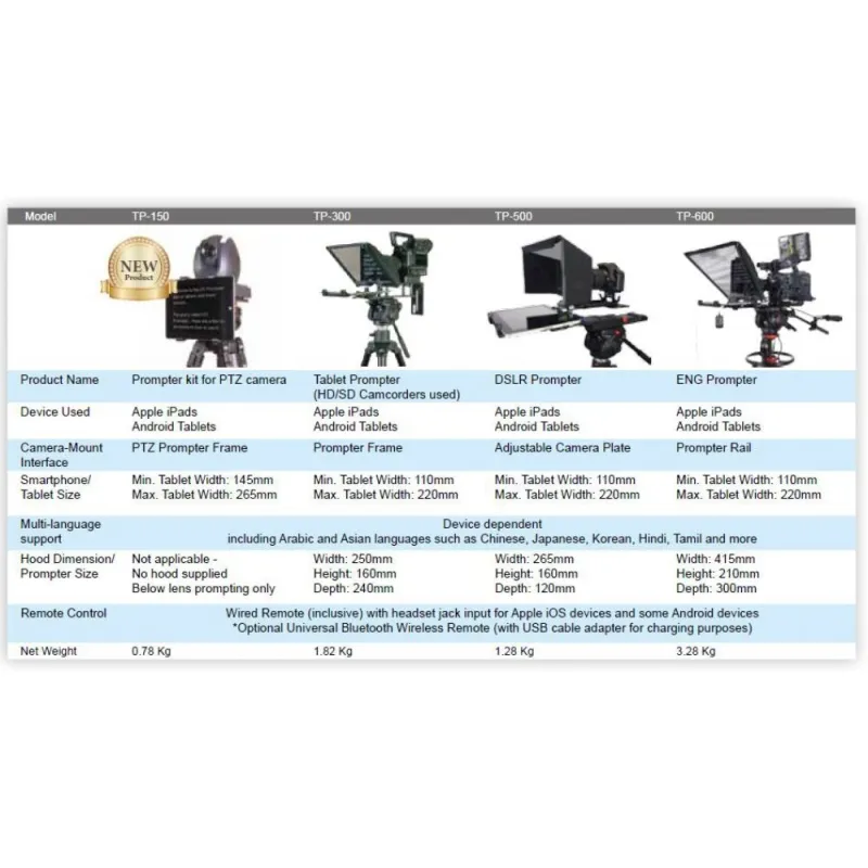 Suitable for tablets up to 11.6". The TP-300 is designed to convert a small tablet into a low-cost and very effective teleprompter.