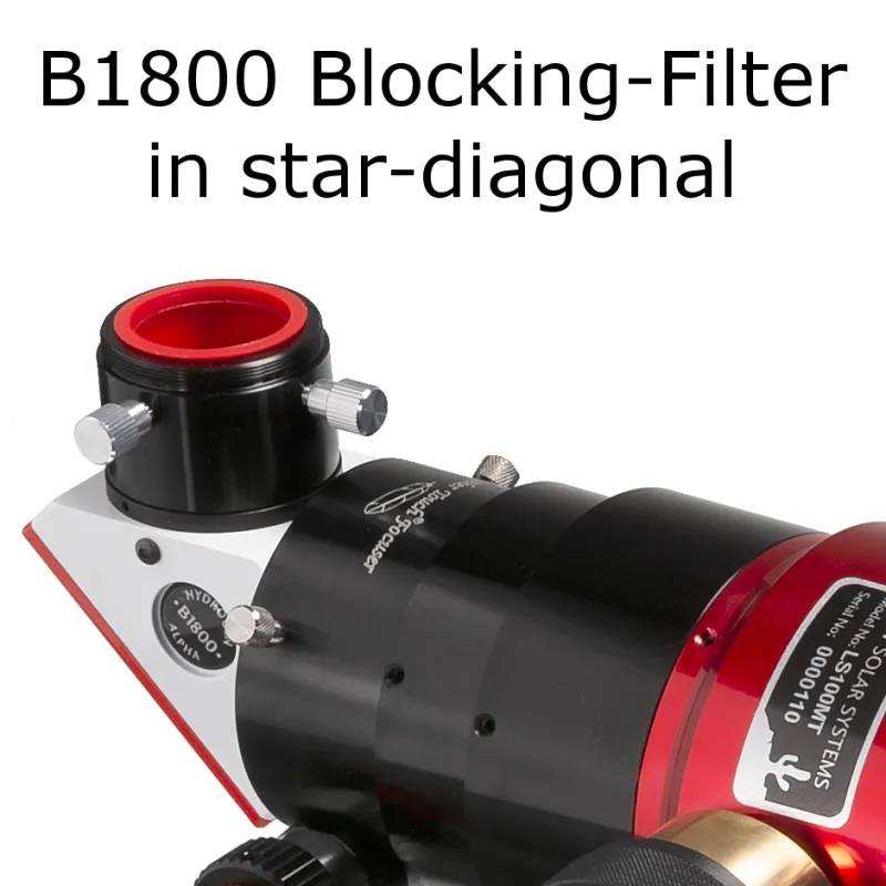 Solar observing in H-alpha: The LS100MT/B1800 is a complete telescope for observing the sun in H-alpha light, with 100mm free aperture (no central obstruction) and 714mm focal length . The H-alpha wavelength is the most impressive way to observe the sun, showing protuberances at the sun's edge, filaments and flares on the surface, and much more. An internal Etalon filter achieves a bandwidth of <0.7 Angstrom with the innovative air pressure tuning system Pressure-Tuner . Tuning is done by slightly changing the air pressure in a pressure chamber inside the telescope. This changes the refractive index of the air, making it easy to tune to the H-alpha line. The pressure tuner guarantees a homogeneous image, without central obstruction, and a permanently protected Etalon without erosion. A set of collimating lenses installed in the telescope ensures best performance. Fine adjustment is achieved with a excellent 2 inch Feather-Touch focuser from Starlight-Instruments with 10:1 reduction . Blocking-filter is the B1800 . The B1800 is very good for visual solar observing. Also solar imaging is possible by cameras with small to large sensor chip. We recommend a LS100MT with B3400 blocking-filter by using cameras with very large sensor chips. The star diagonal in which the blocking filter is installed, is equipped as standard for 1.25 inch eyepieces and with a T2 camera connection.