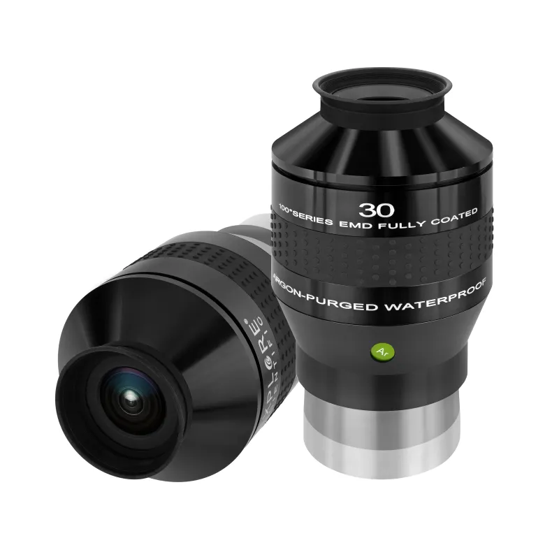 These eyepieces with their huge apparent field of view not only gave the observer a panoramic visual experience, but they relax the eye so the observer could pay attention to subtle details for extended periods. These ultra-wide angle eyepieces played a critical role in the military for aiming at targets, and their long eye-relief counterparts helped reduce eye injury from recoil. Each 100° Series Argon-Purged Waterproof eyepiece is internally sealed and purged with inert, dry argon gas to prevent internal fogging, to halt the intrusion of fine particulates and fungus. This also maximizes the life of the internal coatings. To make sure, every 100° eyepiece is tested by submerging them down to 1 meter of water for 30 minutes. All 100° Series eyepieces are fully multi-coated and edge-blackened to produce maximum contrast.