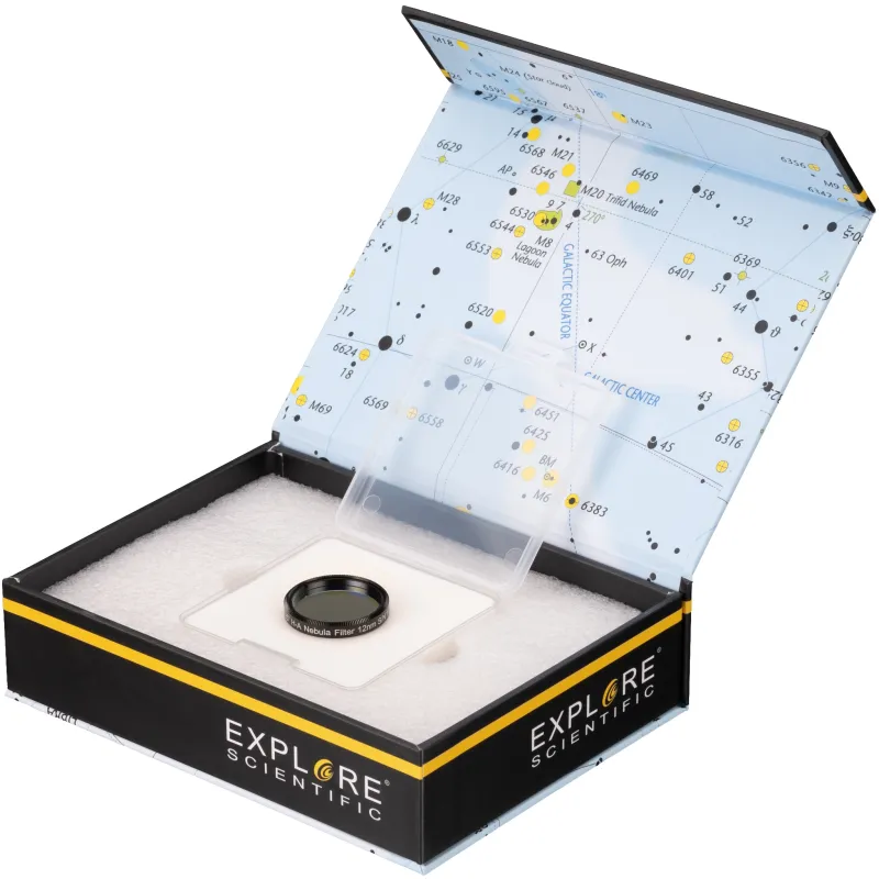 The EXPLORE SCIENTIFIC H-Alpha filter allows photography of red glowing emission nebulae; ideal for use near cities, in slightly light-polluted skies.