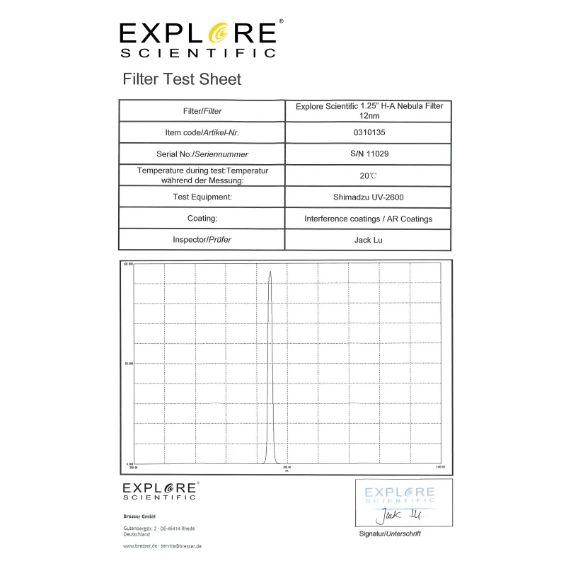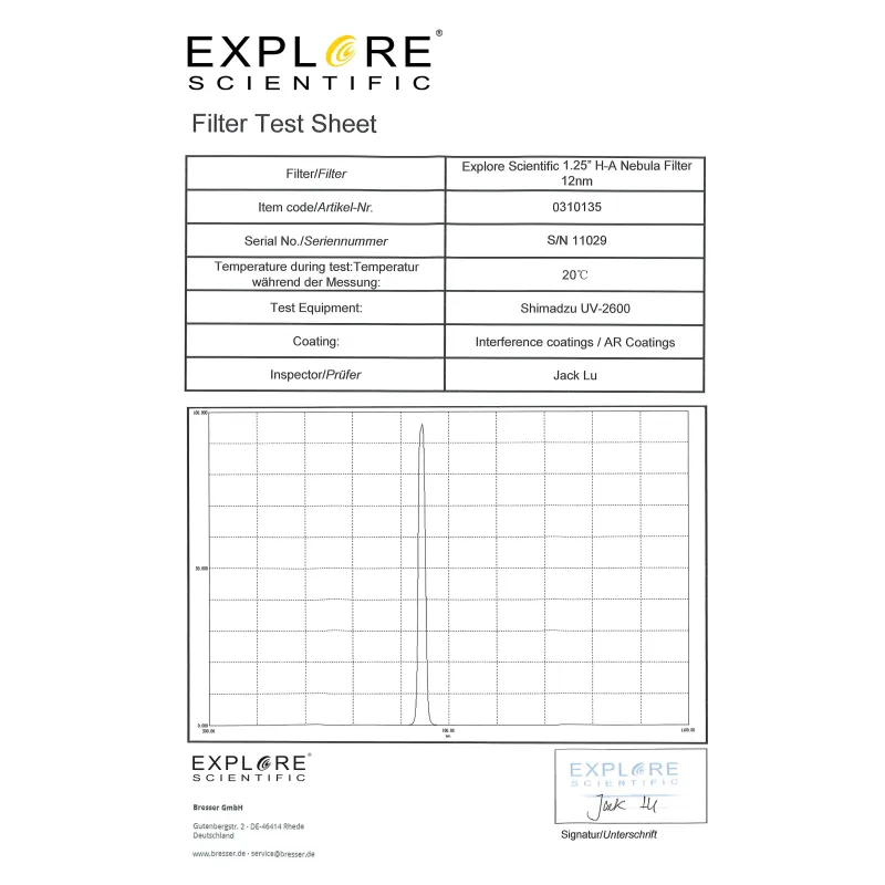 The EXPLORE SCIENTIFIC nebula filters are delivered with an individual test report - so you can be sure to get high quality filters.