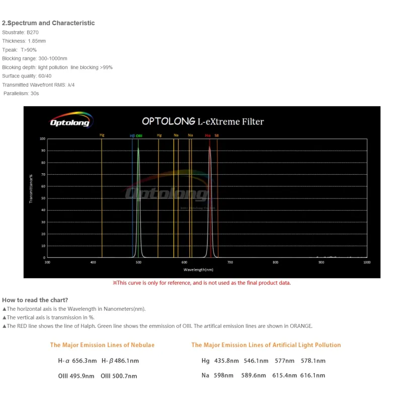 High transmission at major nebula emission lines (i.e. H-alpha 656nm and OIII 496nm&500nm)