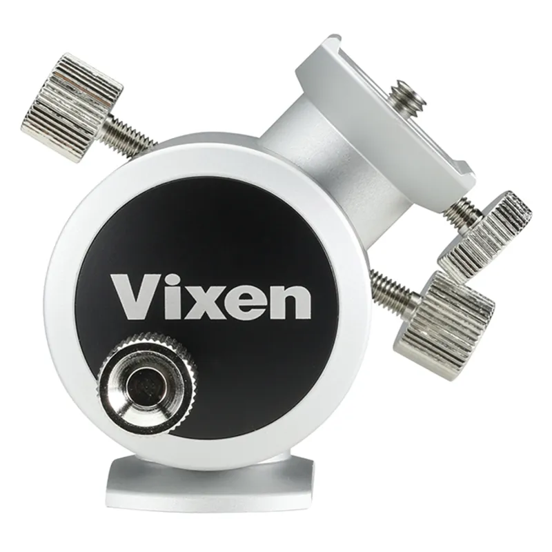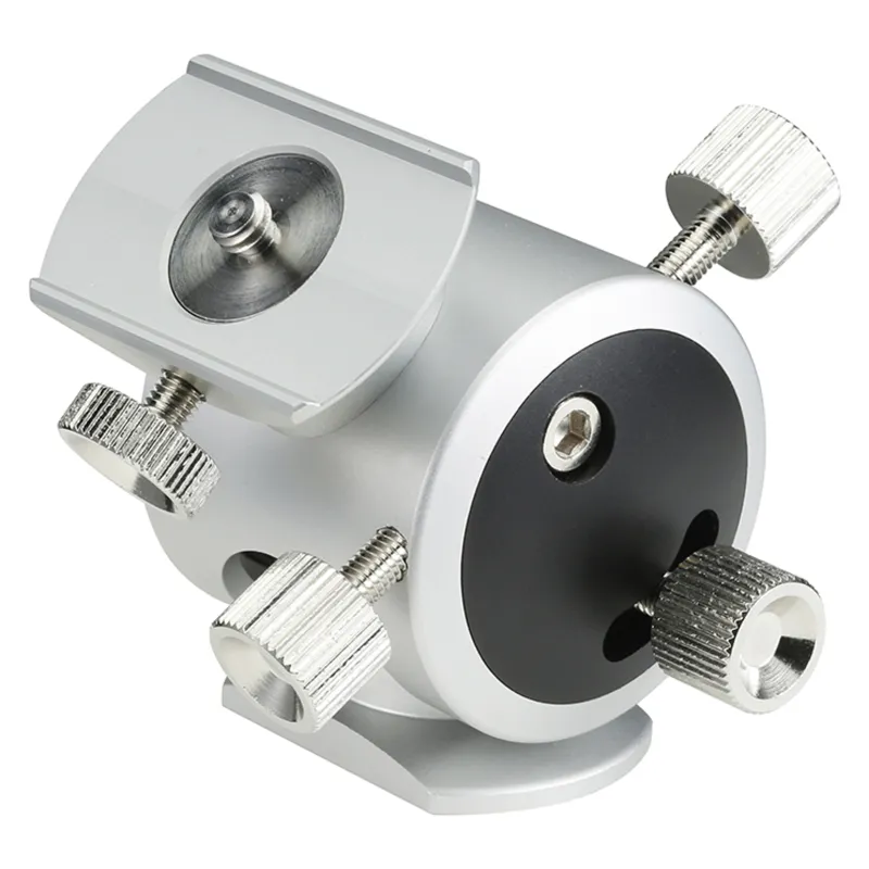 The Polar fine adjustment unit is an accessory designed for installation of star tracking mounts such as POLARIE and the AP Star Tracker System with attachment between the photo stand and the star tracking mount. This device enables fine horizontal and vertical adjustment with installation of a polar axis target. The swivel head , which is designed exclusively for use on the base of star trackers, can be secured or removed with a single screw. The twin screw system for inclination and azimuth adjustment ensures fine movement and rigid locking. The adjustable inclination angle of 0゚~85゚ enables use in a range of positions and situations. The fine adjustment range can be adjusted in three steps of low (0-30 degrees), medium (30-60 degrees) and high (60-85 degrees).